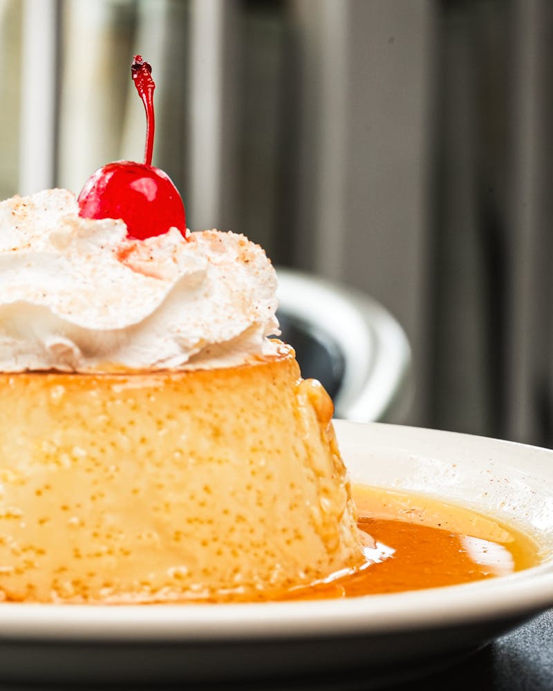 Topped with cinnamon sugar, whipped cream, and a cherry-